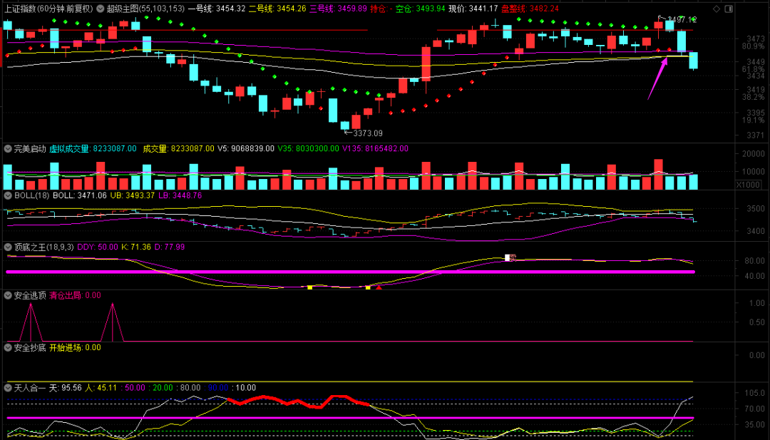 原本走的不错的大盘,在见高3497.12后,前市收盘前又开始拉梭子。60分钟多空转换点3461.03跌破时,我就知道60分钟二号线可能不保,但对这样的走势我并不理会。因为3495.91如果能够突破的话,3524一定会去碰,我预计的是突破3524站不稳就高抛,没想到指数走的如此不堪。虽然我的股票在赚钱,但总觉得缺那么一点意思!
