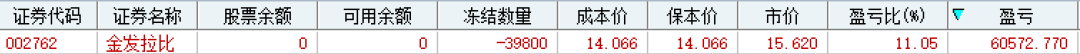 昨天的预约涨停股是金发拉比,谁也想不到今天它会涨停吧?可它今天真的就涨停了,我最初14.25买了19,800股,后来在13.88元加了2万股,今天总盈利超过6万元,也算是在节前助力给我送了一份厚礼。今天出局的资金并没有轻易的再买其它预约涨停股票,因为如果明天有好的预约涨停的话,我还是想干快一点儿的!