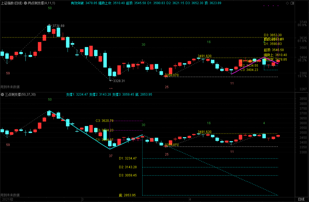 从大盘结构划分角度来看,今天重新回到C1位3465.69之上,只要不再次破收3434.55,短期还是具备一定向上的冲力的。如果3497.12突破而不拉回的话,未来理论计算高度分别在:3590.83、3621.25、3652.30。前提是3524.23要站稳,如果只是突破3524.23的话,再度回破而无法收回,那就要暂时先做高抛处理,待突破回稳时再买回不迟。