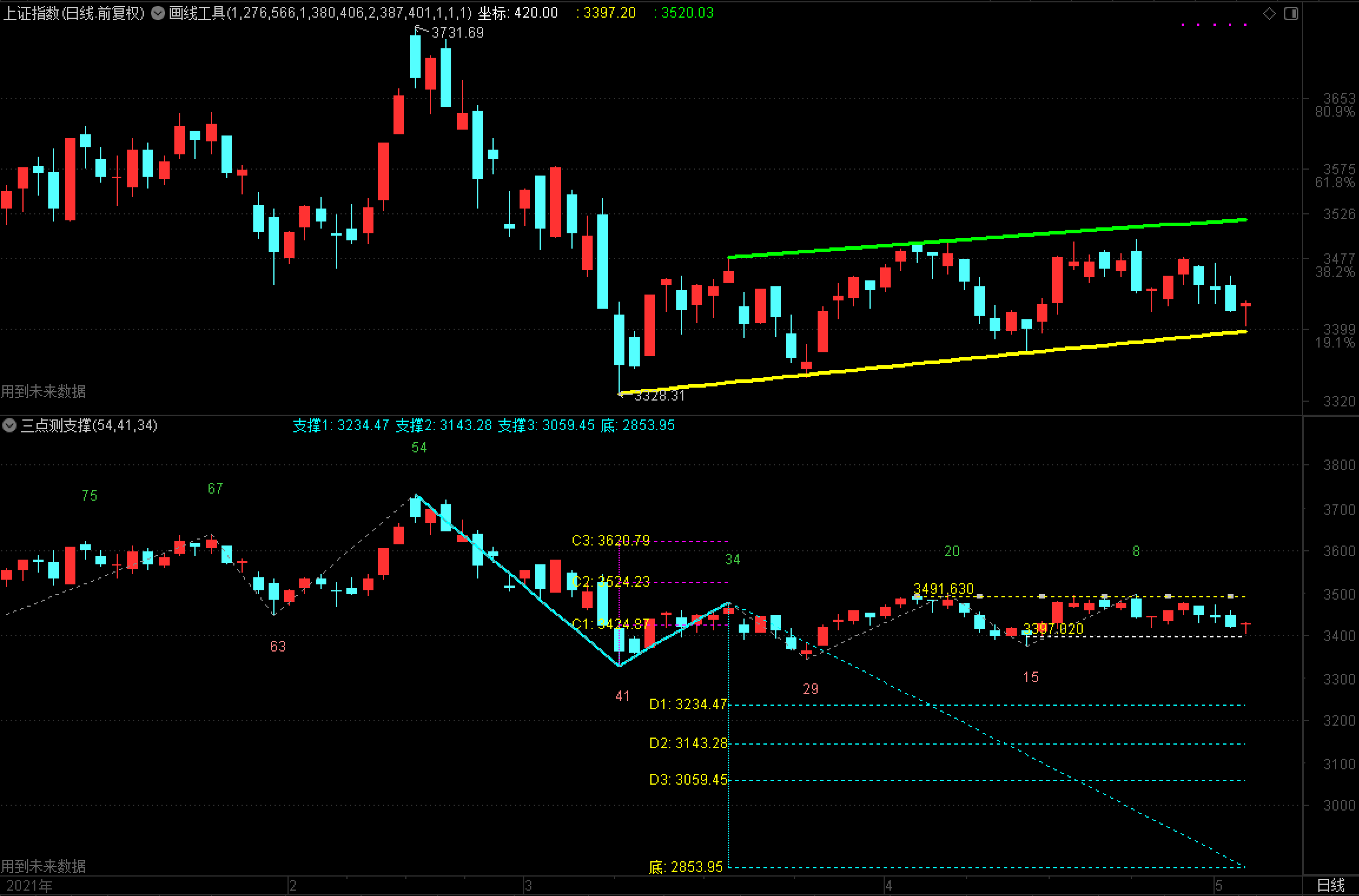 今天大盘走的很水,其实也是意料之中的。主图的小上升通道,其实告诉我们的只有两个定量:一是如果黄色支撑线不破的话,未来还会弹去绿色的上轨;二是黄色的支撑线跌穿,3373.09不能跌破,哪怕0.01点都不行。否则,形成的相对平衡可能被打破。具体今天晚上讲课的时候再说,现阶段还是以个股为主吧!