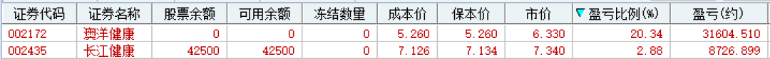 澳洋健康早上开盘价获利了结了,超过+12个点的获利,虽然不及涨停来的漂亮,但我还是比较有危机意识。7.12元买入长江健康42,500股,澳洋健康、悦心健康都涨停了,想着这次怎么也能跟一下。结果却事与愿违,表现得并不是太理想,看看明天能不能异军突起来个涨停,再决定该股的去或留!