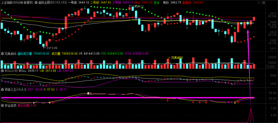 短线大盘的隐忧,主要来自于60分钟的安全逃顶信号,虽然60分钟二号线3447.63是被收复状态,日线天人合一指标也支持大盘继续往上走,但“国家队”控制下的A股,反技术的情况时常会出现。所以除非60分钟顶底之王指标继续顺畅性上行,否则一旦死叉的话,将对短期大盘构成较大威胁。这是不能忽略的问题,说出来仅供大家参考。