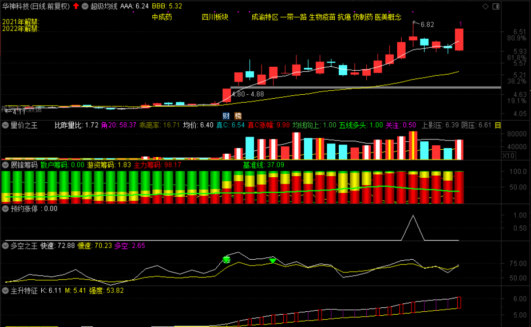 预测涨停选股系统预警的华神科技,作为红包G分享之后,短期表现的非常一般,在5.88元时期C1支撑位,连续三天回踩不破,身体跟涨停大阳线也很正常。接下来,不管是否还有机会继续上行,作为一只短线的品种,无疑都是非常成功的。另一个侧面,也说明此种方法值得借鉴学习!近期定投抄底个股出局众多,在文章里我就不一一点评了,今晚免费直播讲课的时候,我会专门做题及点评,有兴趣的股友可以过来看一下,顺便再深化学习一下操作方法!就这~~