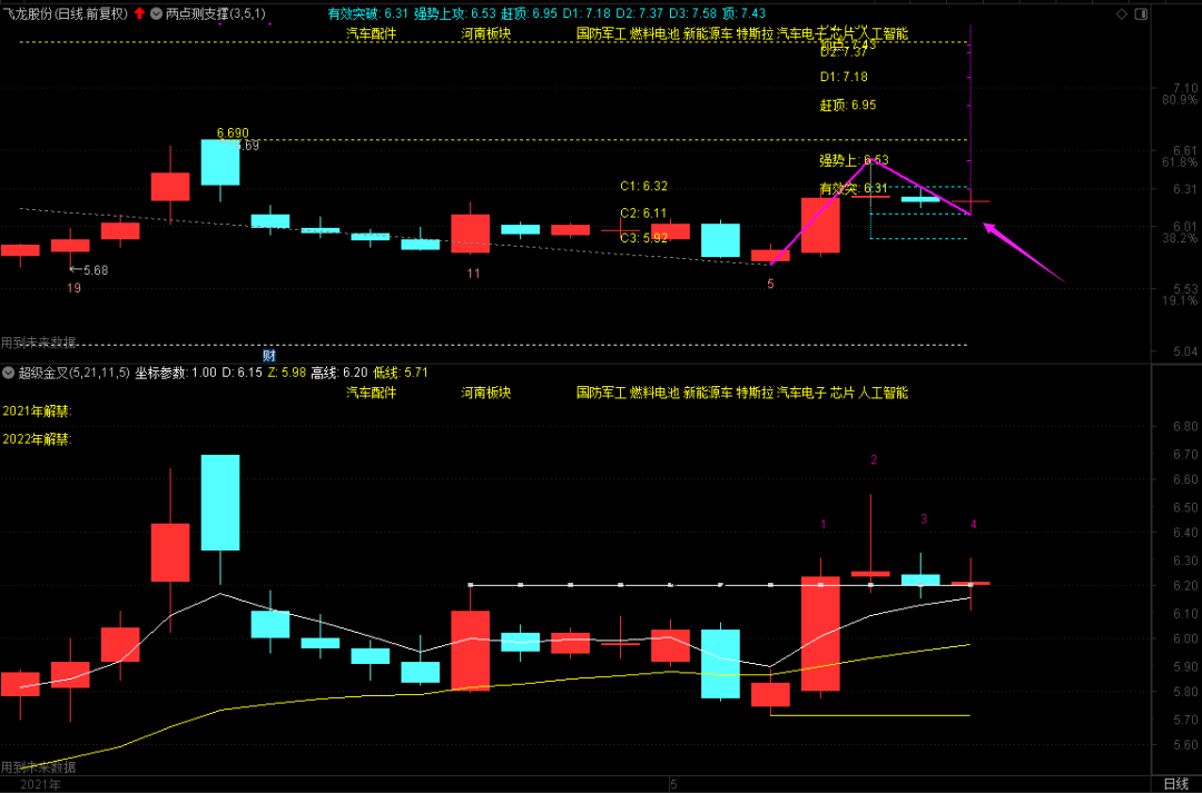 前市11:05左右,6.11元挂单的飞龙股份成交。虽然这是该股首次下探C2支撑位,但感觉短期问题不是太大。因为本周三该股发出了涨停预警信号,按照超级金叉21日指数平均线方法来看,短期该股或许还有向上拉起来的潜力,你对该股怎么看?有兴趣的朋友可以留言探讨,上述仅为个人操作之心得,切勿模仿之!