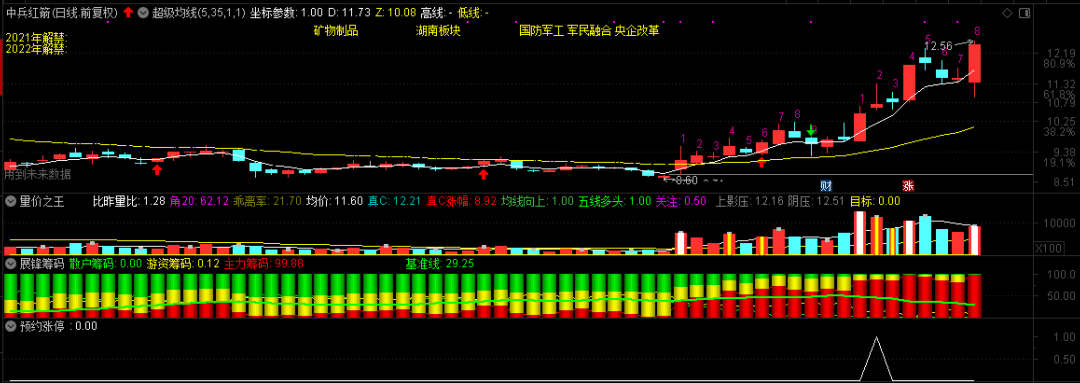 中兵红箭是5月6日预警的预约涨停股,昨天作为红包股分享推送后,今天见大盘出现大幅上涨,有的股友就沉不住气了。一个劲儿在微信上问我该怎么办,其实小的操作计划都制定好了,不管是止盈止损照着做就是了,就算你买在11.38又如何呢?每班最高冲到12.56元,难道这钱不是白捡的吗?