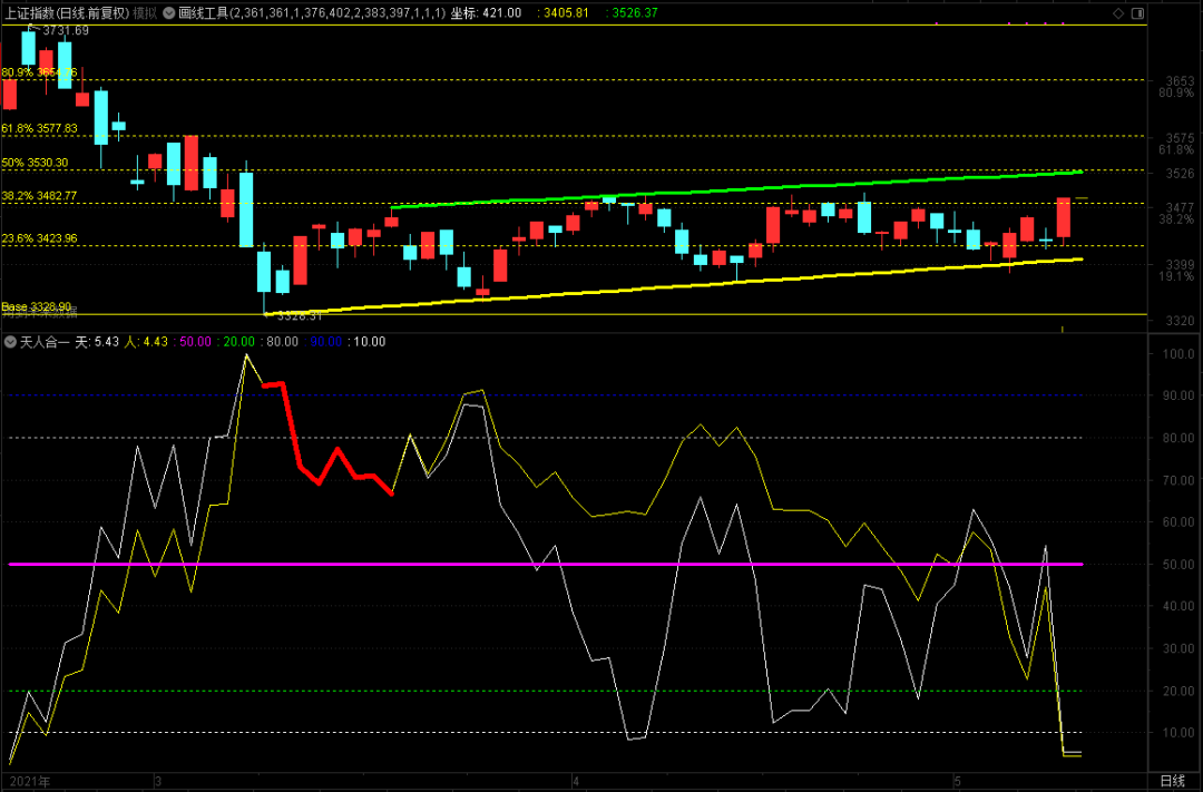 今天大盘收出了一根长阳,天人合一的人线到了4.43,指数首次收盘突破0.382黄金分割位3482.77。半分位的位置在3530.30,下周一绿色压力线的位置在3526.37,也就是说。3526.37~3530.30将构成周一最大之压力带。所以,从我个人角度讲,如果这个压力带不能够有效被突破,短线或构成最佳的高抛良机!