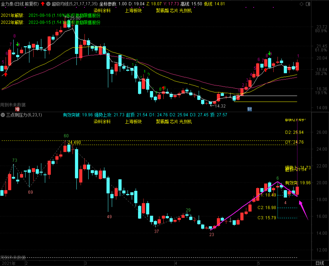 最后说一只与文投控股相类似的个股:金力泰!该股日线级别经过一波拉升之后(23~6),5月17日直接采购18.49元的C1支撑位。而后连续收在18.49元之上,今天再打18.49元就构成极佳的买点,如果可以突破20.13元的话,那么短期该股的压力位在24.76、25.94元附近,你觉得这只股票能达到预期的空间吗?欢迎文后留言一起探讨~~今天晚上20:30一就开始讲课,21:00~21:30分培训DFH技术使用技巧。有兴趣的朋友可以过来听一听,就这!