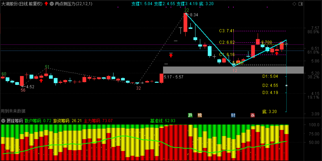 今天把大湖股份委托在了7.40元,这是我惯用的伎俩之一。因为我看它盘中一度站上了C2压力位6.82元,如果能够保持住的话,那么挑战7.41元压力位将不成问题。我也会在它上冲时,顺利拿到止盈的利润。结果冲高后出现了回落,还好主力筹码73.07,没有大意外的情况下,短期应该还有一定的向上冲力。