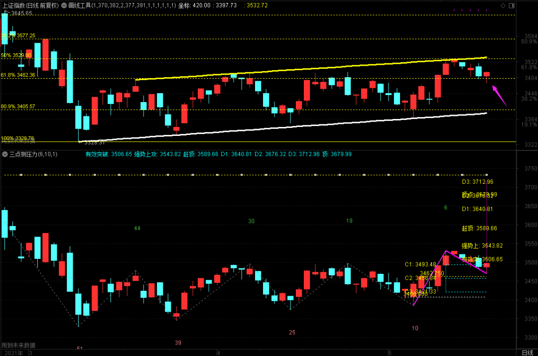 今天大盘所有的依旧很纠结,虽然最后勉强收回了3493.48,但整体上看上去还是不够强。3456.84还会不会去碰?这是第1个疑问,再往上做一次伸展的话,会不会是回光返照?这是第2个疑问。从黄金分割角度来看,3482.36被连续站了三天,理论上是有回光返照机会的,如果深证综指、创业板综指、创业板日线安全逃顶信号不能化解的话,回光返照就不能避免!