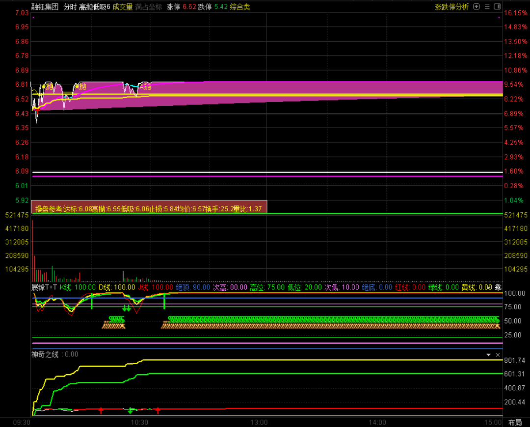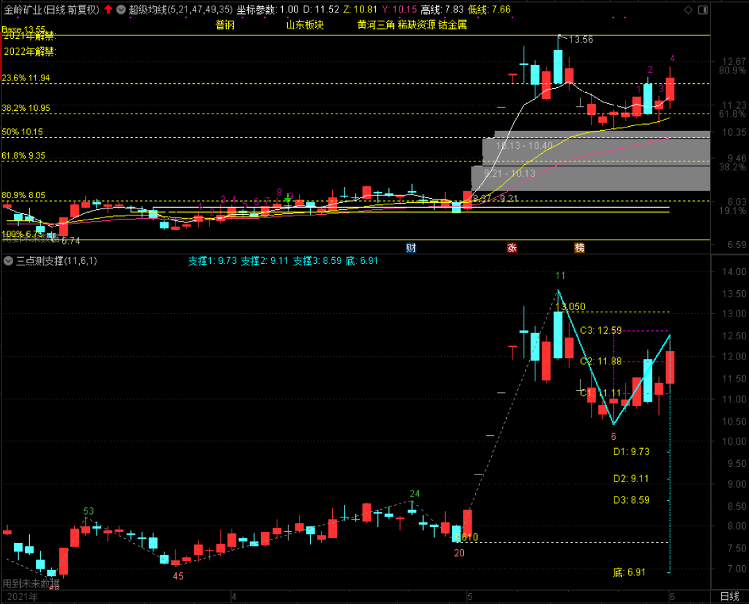 金岭矿业今天一路封上涨停板,虽然最终打开了,但依旧收在了压力带11.88~11.95元在上,我很自然的做了逢高获利了结,因为给出的建议也是仅供参考,所以至于别人怎么做的,我也是不得而知。这只股票后面看11.94~11.88这个支撑带能不能撑住?想要有大的发展的话,黄金分割率0.382是必须要站稳的,你觉得呢?