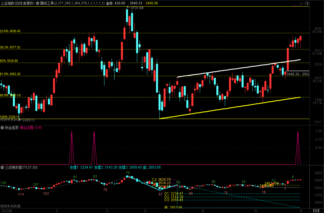 安全逃顶信号的问题不想多讲了,大盘下档有两个支撑,一个是0.382黄金分割位3577.52,另一个是半分位3529.90附近。通常情况下0.382是不容易被跌穿的,一旦跌穿的话,半分位守住的概率其实也不大。当然,这是一个提前的预判,如果黄金分割位0.382不跌穿,那就继续在里面折腾,直到你自己的精疲力尽为止!