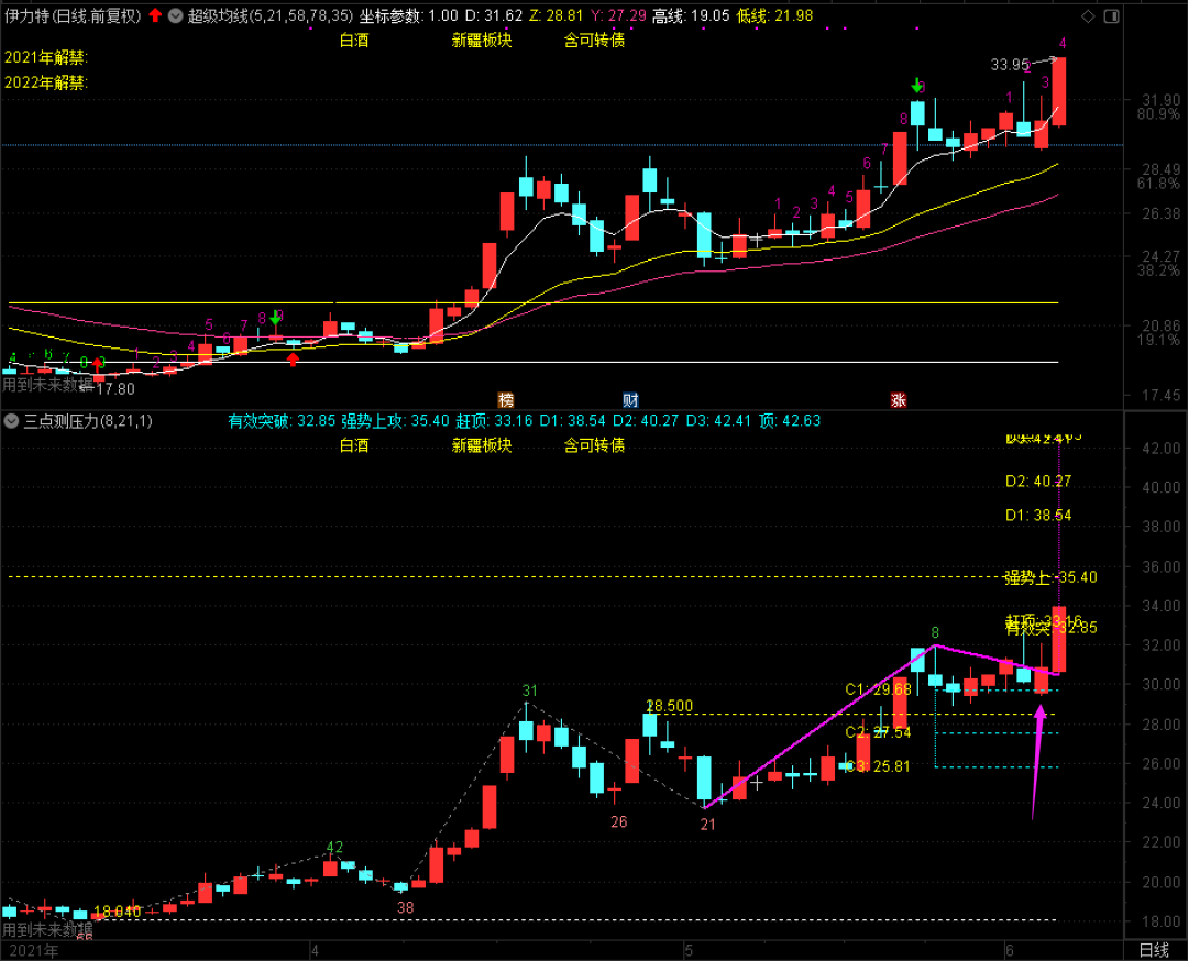 昨天的红包股市伊力特,我29.50元推送分享的时候,有些股友还觉得有问题,C1支撑位是在29.68元,在这个位置已经徘徊了6天。说明这个位置的支撑作用还是蛮强的,它29.50元开盘,我觉得正好是一个不错的买入价位,事实证明我的这种判断是正确的。虽然今天上午33.33元,我做了高抛获利了结,但拿到应该拿到的利润,其实我已经很满意了。