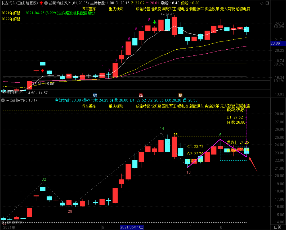 我今天高抛获利了结了金龙鱼,在22.80元买了1/3仓的长安汽车,该股在C2的22.79元已经盘旋了4天,今天收盘正好在22.79元之上,按照结构买入原则,这个操作是没有毛病的,22.99、23.54、24.08元是三个反弹压力位,你觉得短期会不会有向上反抽的动作?欢迎一起文后留言探讨,我们只有互相交流,才能有一个共同提高的过程!今天就不多写了,20:30继续讲堂课,有兴趣的及时来观看交流!https://mmbiz.qpic.cn/mmbiz_gif/EjWT3aPdUQa7TZBrKHtMrwHOicRnosur72LqYCE9icP8XHoZmloFAXlAITFnwNot9qJoW8K3eJDibCyDUNvhWWnFw/640?wx_fmt=gif