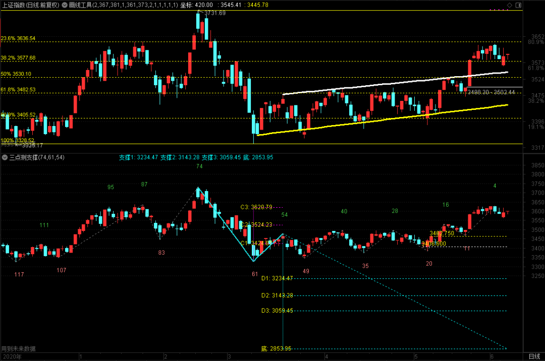 今天大盘总体就是一个震荡,3577盘中一度逼近,但没有触及或跌破,说明各方还是挺看重这个位置的。如果3577打穿收不上来的话,那么下跌调整就可能变得比较剧烈。现在大盘压力3620、3636-3640,极限在3655附近,突破站稳才有新高的机会。否则,继续震荡或下探仍是主基调,大家一定要特别的注意和小心!
