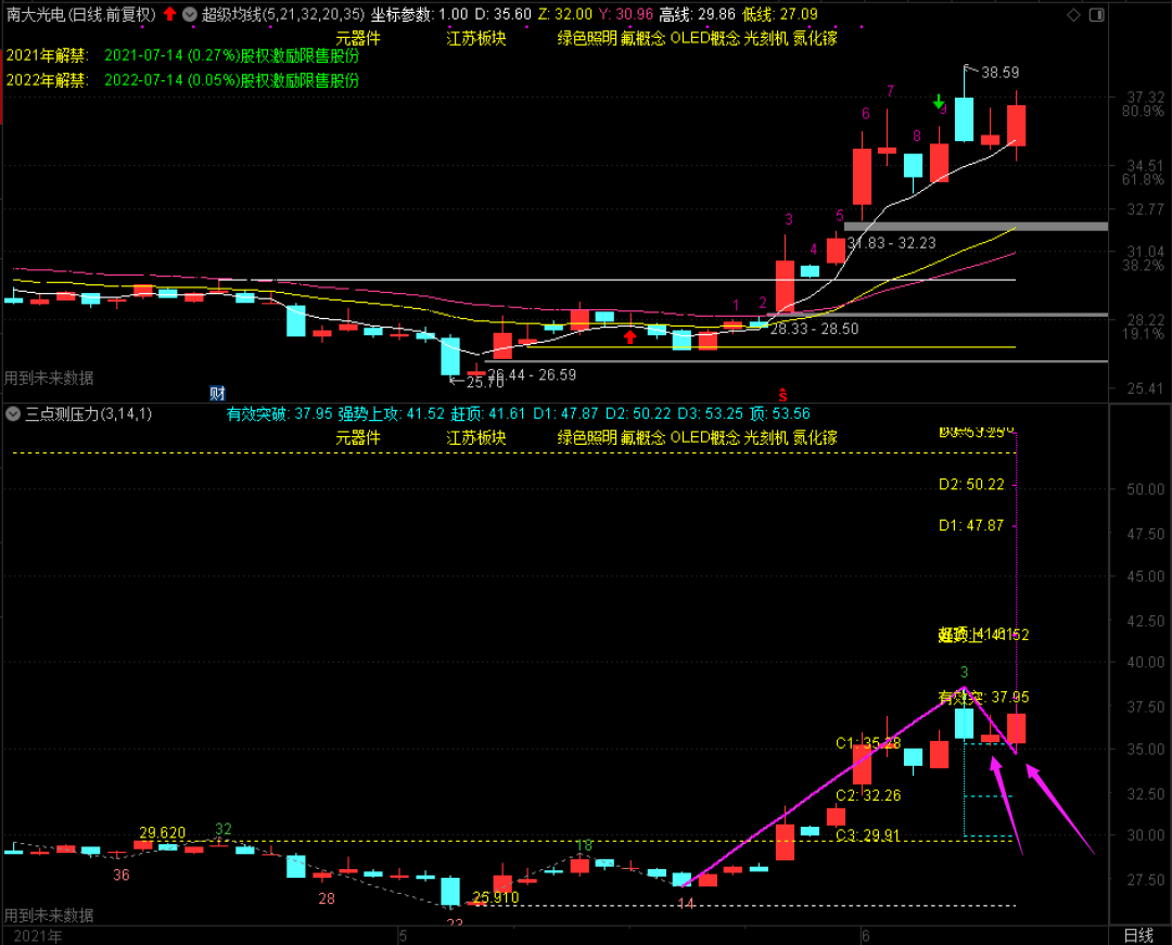 昨天的红包股南大光电,今天走得特别漂亮。它C1支撑位在35.28元,我的买入价格是35.35元,该股是6月2日预警的预约涨停股,今天我判断它的高点是37.58元,结果是分毫不差,虽然仅有+6%以上的涨幅,但对于短线玩家而言,这已经非常足够了。接下来,该股应该还有一定反复的机会,有兴趣的可以纳入自选股做观察!