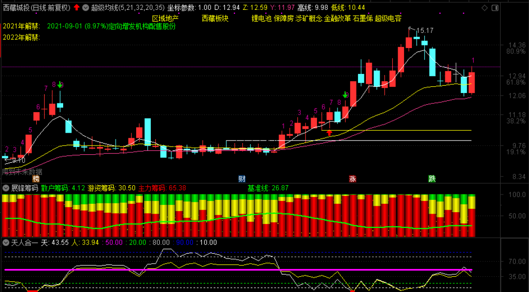 昨天文后点评了西藏城投,今天该股午后一度封上涨停,有人说就是我点评的原因,导致了该股的冲击涨停。我觉得,千万不能这么说,我只是解答一下股友的提问而已,没有能力点石成金。从今天该股的态势看,天人合一人线已经再度向下走,主力筹码65.38,13.49元是该股的C2压力位,突破站稳的话,才往14.22元的C3看!