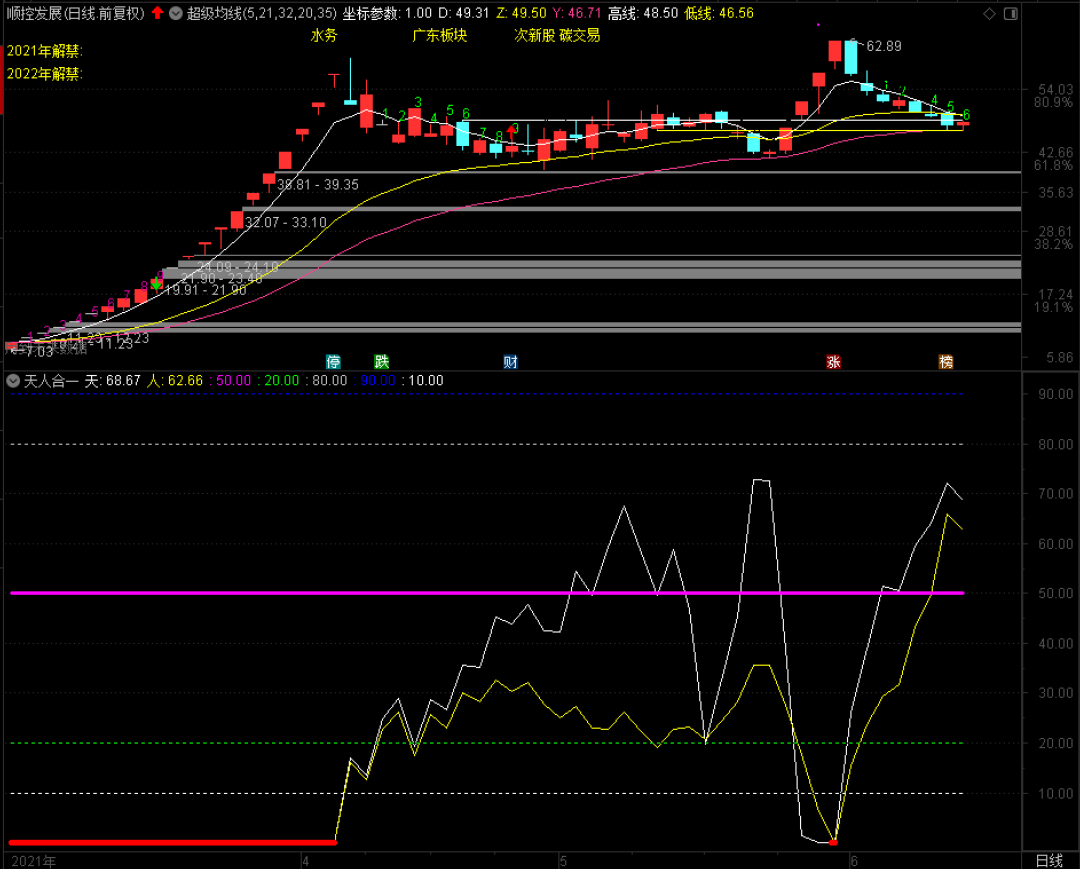 昨天点评的顺控发展,今天是小周期下跌第6天,除非明天收盘在50.01元之上,否则这个下跌数列很难很快结束。这里要特别说一下,35日指数平均线必须要盯紧,上一次止跌在这根线上,这根线就显得尤为重要。一旦再度跌破而无法收回,这样的股就不要再看。此外,要注意反抽10日线收复与否,这也是非常关键的!篇幅有限,就写到这里吧,大盘我有一种不好的感觉,大家也谨慎一些!