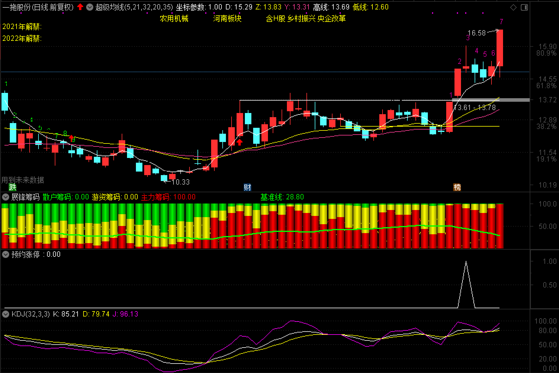 一拖股份是6月9日的预约涨停股,我是6月10日和11日连续红包G推送分享的,昨天还有朋友因为没有高抛而懊悔,今天该股逆市打出涨停板,让不少参与的股友兴奋不已。接下来怎么样我不知道,毕竟已经竖起了大阳的大旗。如果接下来连续上行的话,技术指标也是非常支持的,恭喜那些参与了的股友!
