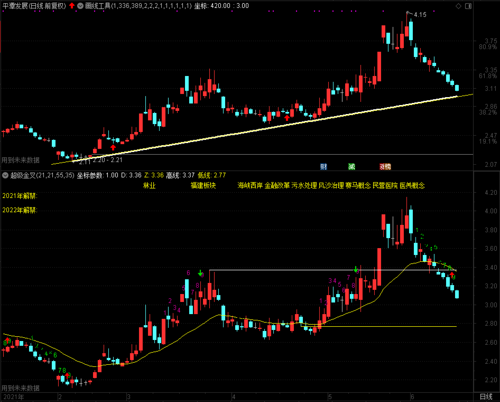 昨天说了平潭发展这只股票,今天该股继续下挫。从日线图观察,明天该股上升趋势线运行至3.01元左右。正常情况下,上升趋势线的支撑作用还是蛮强的,加之21日指数平均线今天与前期高点交叉,短线或许会产生向上的变盘,有兴趣的股友可以多多留意。既然该股也有医美概念,作为林业龙头的短期力量不可忽视,能否形成变盘转折?不妨一起边走边看~~我最近对GS队个股的操作是有问题的,我会继续认真总结,领会如何做到小亏而大赢的真谛,给我一点儿时间,我相信会有所收获的!