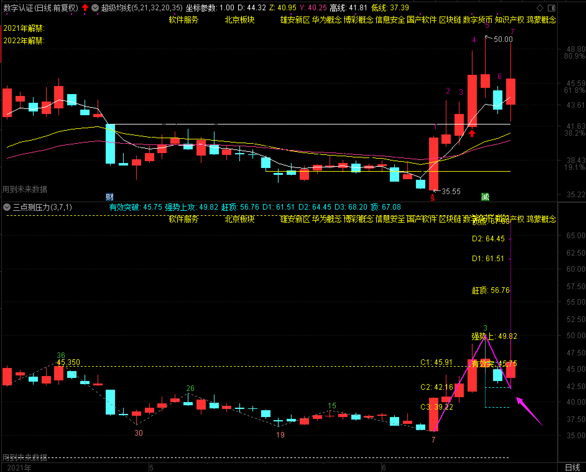 每一只预约涨停股,都是我们旗舰版用户关注的重点。今天收盘后,有旗舰版用户告诉我,他在43.43的5日指数平均线,和C2支撑位42.16元,分别买了1万股数字认证,问我这样买对不对?其实他做对了,看来是认真听过课的,因为每一只预约涨停股,我们第1次买入的原则都是5日指数平均线数附近,结构划线是我们其次的选择,就这样坚持下去非常好!
