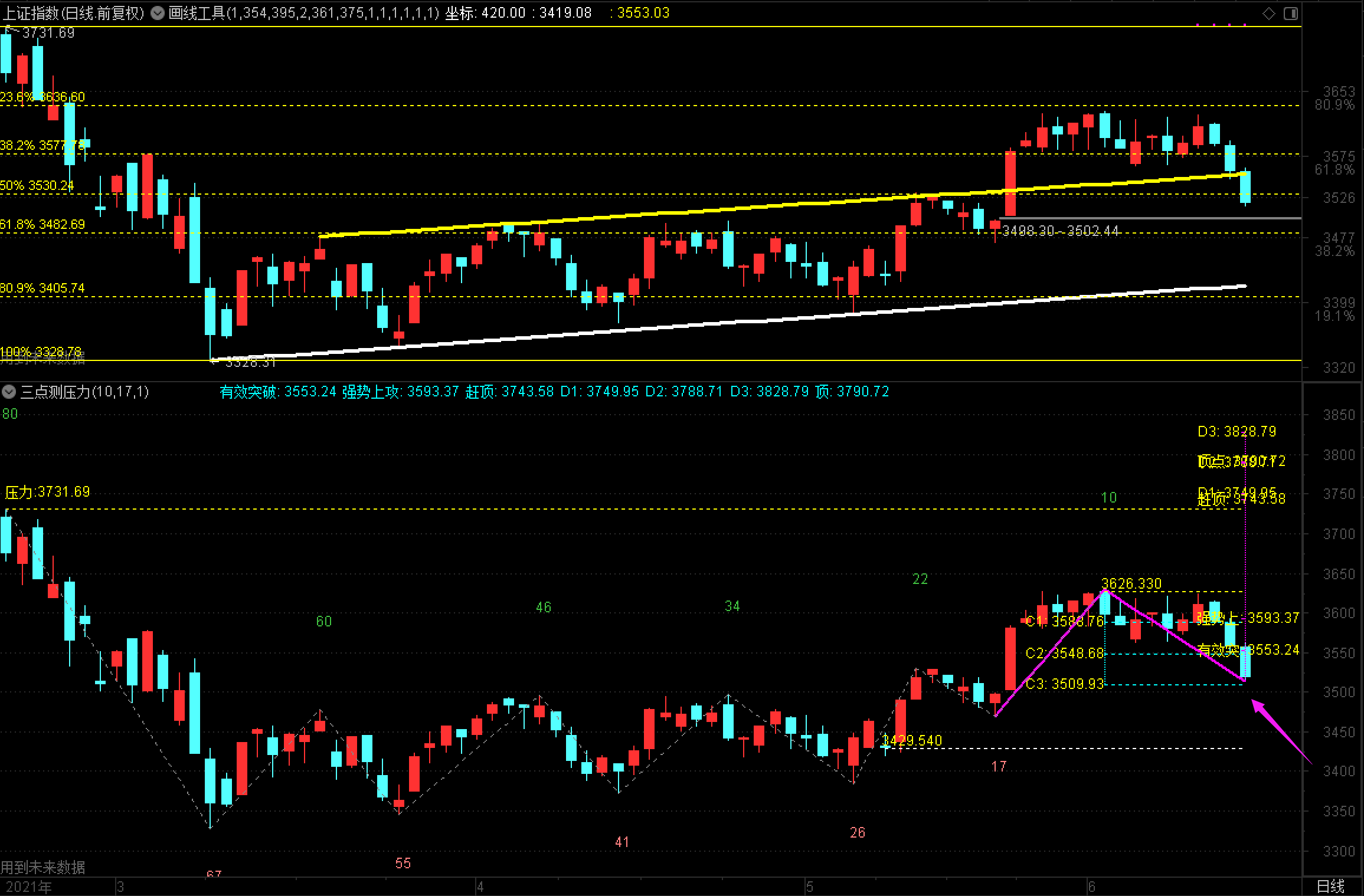 这几天一直在讲3577跌破后的问题,恶果今天就来了。3530没有见到任何支撑作用,这也是前面我讲过的。指数最低探到3513附近,距离我说的3509已经距离很近,现在最怕的是先反弹,而不去先探3509,因为先反弹的话高度很有限。明天前一个小时注意3528.16,能够突破站稳的话,再看3548.68,然后再看3577能否收复,不能的话盘中再分析!