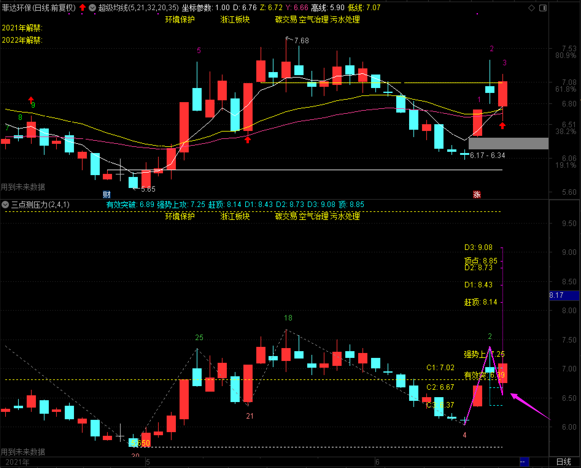 昨天开盘7.05元买入了菲达环保,今天在6.67元C2支撑位加了同仓,股价反弹起来在7.16元做了个高抛T,有朋友纳闷儿为什么要卖呢?其实盘中加仓做T+0,最主要就是想降低持仓成本,对于这样刚启动且指标较好的个股,完全可以反复的做T+0。接下来,如果能够突破站稳7.25元的话,这个个股的短期还是很值得期待的!