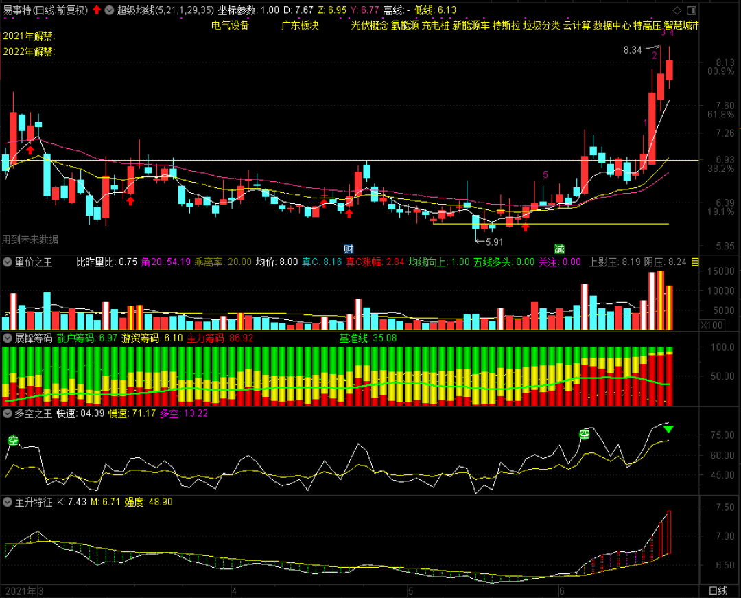重仓持有的易事特,今天我比较犹豫。小周期上涨进入第4天,没有突破8.34元创反弹新高,多空之王有绿色三角高炮信号,预示着该股短期上冲后可能出现回调。我今天在8.38元做的委托高抛,盘中股价最高冲到8.33元,如果明天不能够再度向上突破的话,我考虑先做一个高抛,然后在回落的适当价位后买回。你对该股有什么看法?欢迎文后留言探讨~~