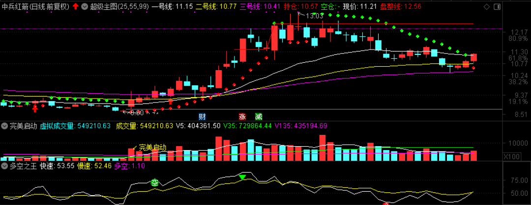 中兵红箭今天突破了11.16元的多空转换点,各项指标虽然没有完全的收拢,但形成的短线反弹已经势不可挡,11.62、12.23元是接下来的压力,12.23元突破之后才会有质变,否则再走好的难度会非常大。短期只能考虑先做做反弹,在中期没有发生改变之前,就当反抽对待吧!