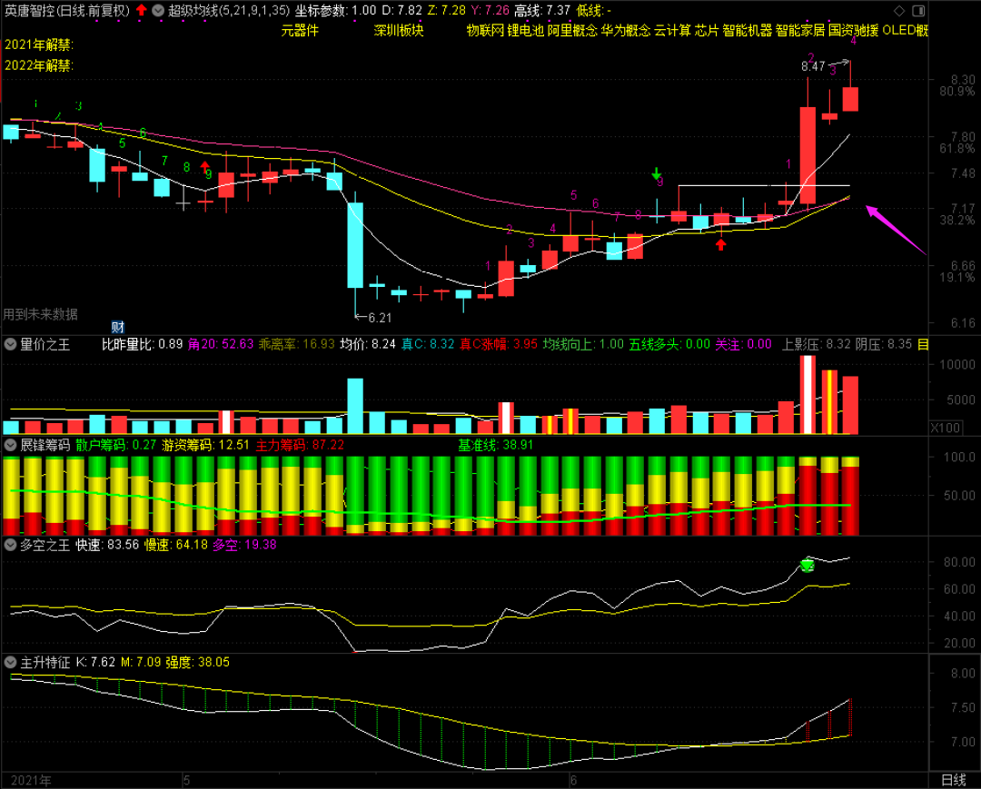 英唐智控和易事特走的差不多,明天21日指数平均线就要和7.37元交叉,通过沙盘推演可以看得出来,只是二线重合,由此所产生的变盘一定不能小看,毕竟短期已经涨了两块多钱,如果接下来不能够继续向上创新高,做短线的朋友还是要小心一点儿,能力不强的就以5日指数平均线为止盈位置,能力强的可以在盘中积极把握!就写到这儿,今天依旧20:30直播讲课,补充说一句,白酒今天被舍得酒业带崩了,相反一线白酒的机会可能就来了,就算是给大家一个参考吧!