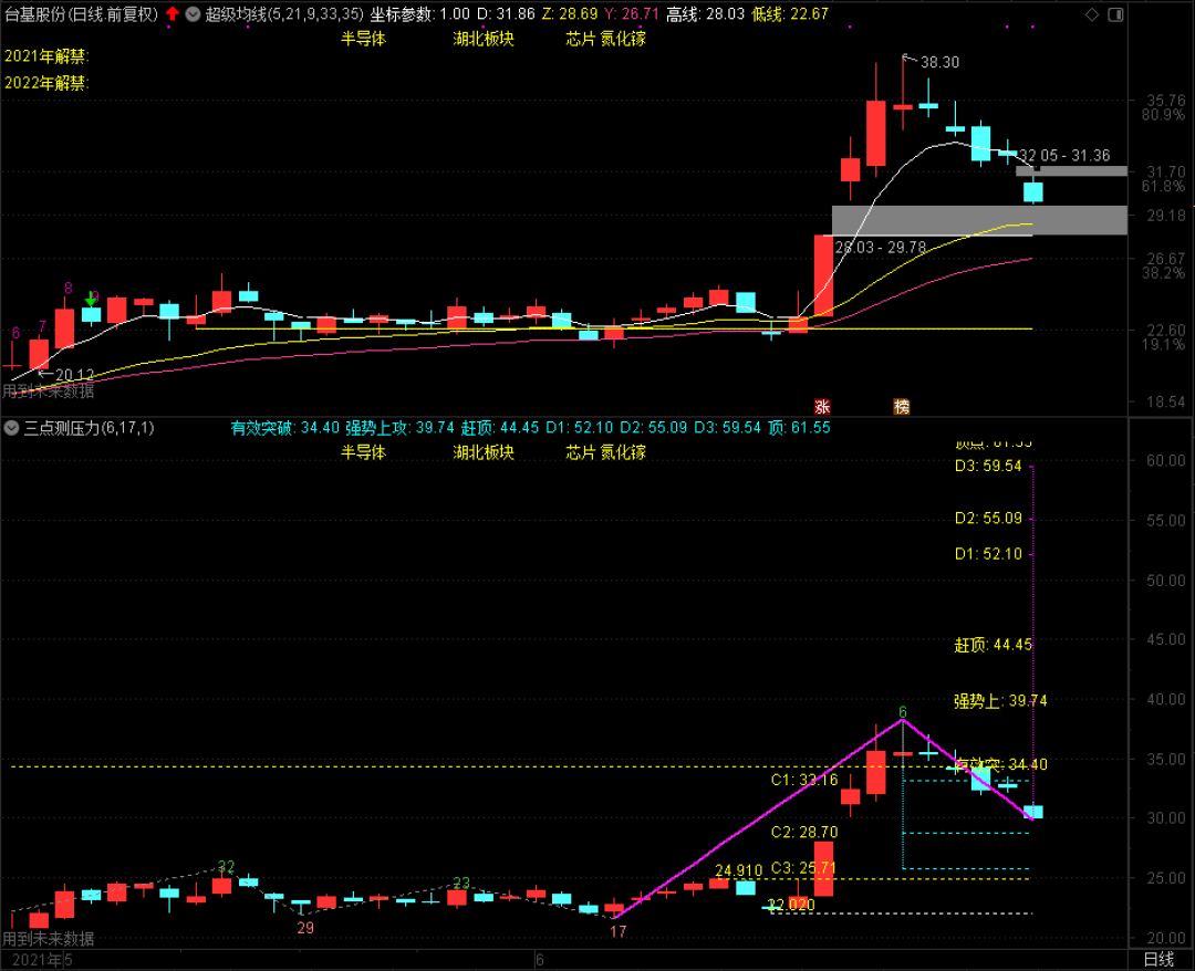 台基股份见高38.30元后,出现了连续调整的走势。就主图和副图结构来看,21日指数平均现在28.69元, C2支撑位在28.70元,如果明天有机会下落到该位置附近,最好是探到28.70或略破28.70元,那么短期该股将构成不错的买入机会,如果能站在28.70元3~4天的话,那么该股的短线是非常值得期待的!