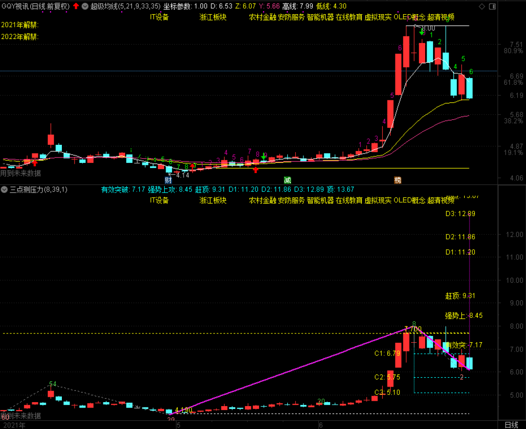 6月18日预约涨停预警的GQY视讯,已经连续调整到第6天。从主图观察,该股21日指数平均均线在6.07元,结构C2支撑位在5.75元,35日指数平均线在5.66元,如果还有惯性下挫的话,5.75和5.66元构成较强的低吸支撑,然后股价或会展开新一轮的反弹。有兴趣的股友可以研究一下,这样的股票后市会不会有一定的机会?