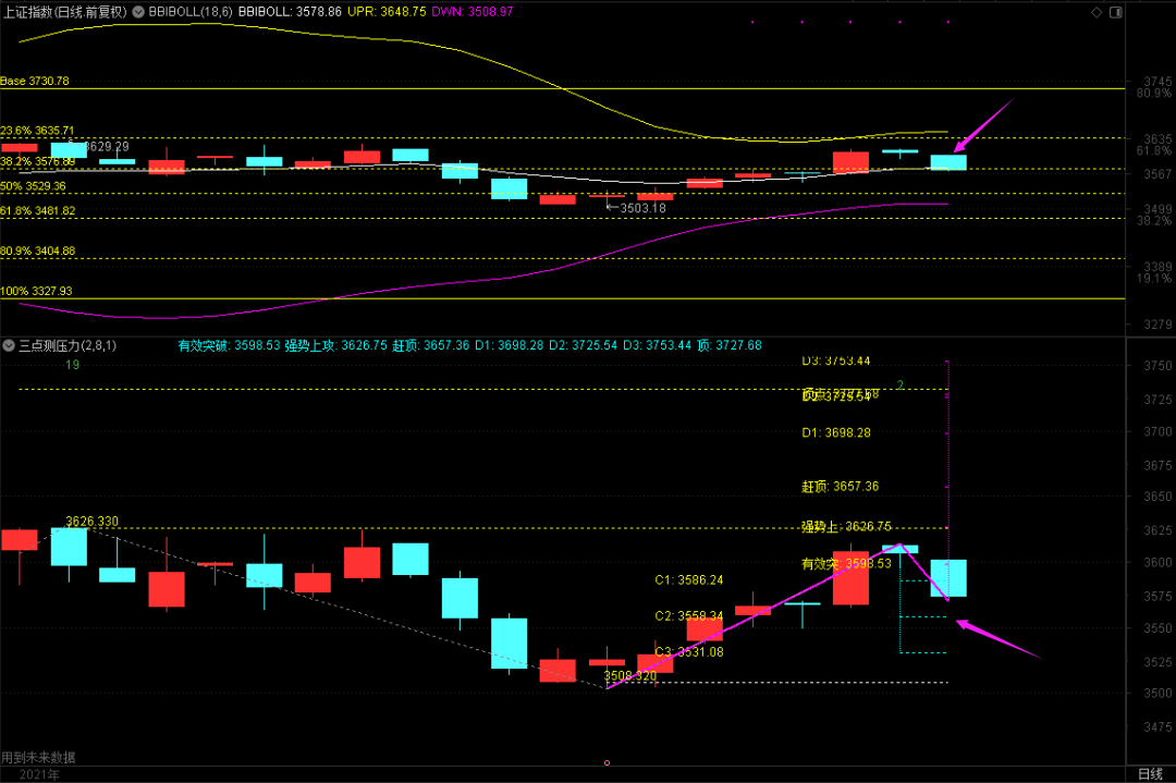 昨天讲课的时候说过,BBI布林中轨的3578.86不可以破,重要的黄金分割位3577也不可以有效破,否则接下来的走势会相对复杂。今天收盘3577被收破了,如果不能及时收复的话,别说下面3558.34的支撑位,恐怕指数要重新回到3509~3490低吸区才可以。当然,这里也有一种突破3629.29的变化,不管能不能到3636~3655,突破站不稳的话,到时候一定要高抛!