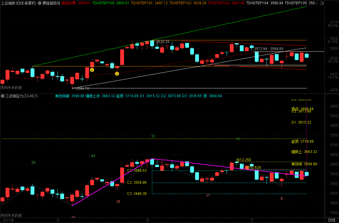 本周大盘在3566~3504区间做震荡,日线迟迟没有收复上升趋势线,下周一该线将上移至3595.33。日线结构上我们看到,3566.53-3504.86-3446.30非常清晰,中枢位置是3504,如果能够突破站稳3566的话,大盘短期仍然有向上挑战上升趋势线的机会,当然这种情况出现的话,记得先做减法为主;3504回调不破,可以考虑逢低吸纳,否则可能去考验3446点!