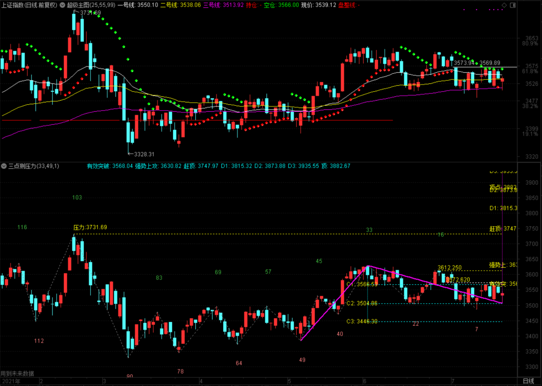 大盘继续在3566~3504区间做震荡,今天最低看到3506附近,盘中一度翻红,收盘微微收绿。日线级别处于一个由多翻空的状态,明天的多空转换点在3566,哪怕突破0.01点,指数也将再度翻多。此外,现在大盘在3566~3504~3446间做循环,中枢位置是3504,只要这个位置不破,3566突破站稳后,市场才会迎来大的上涨波段。