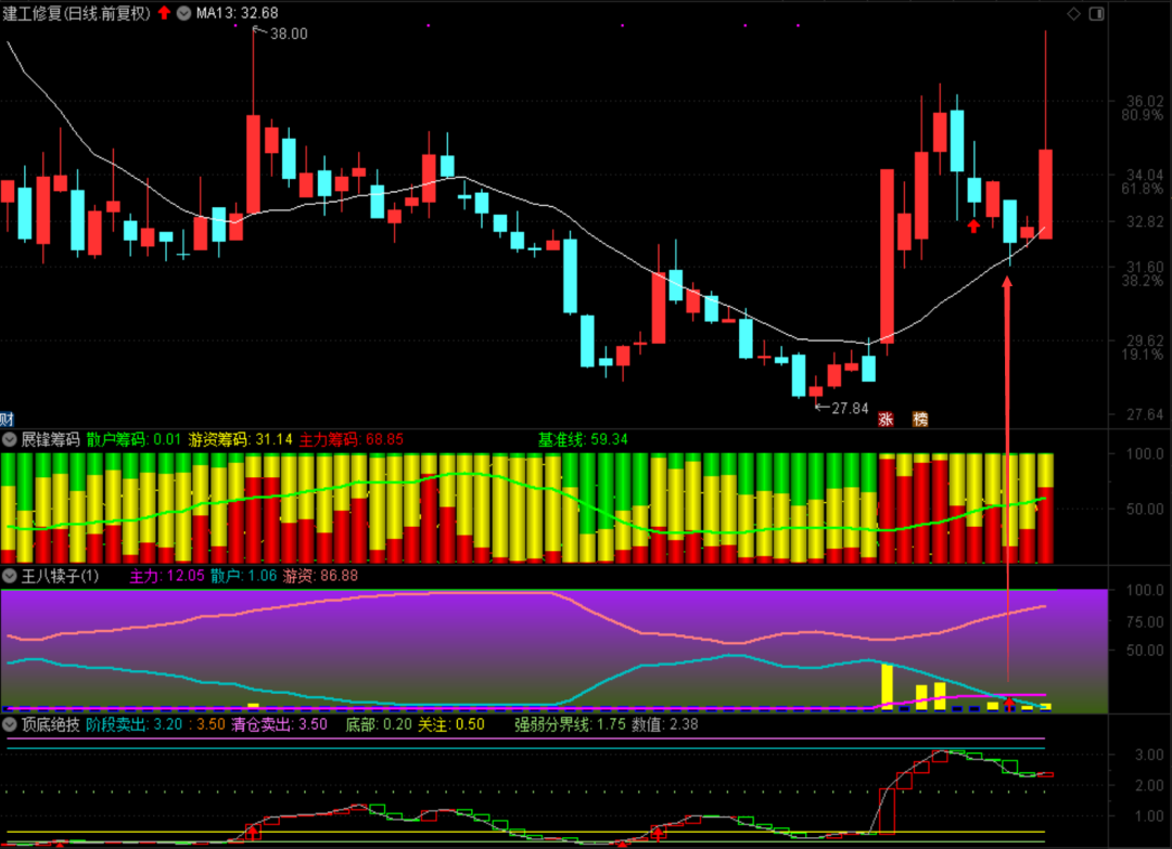 这几天一直在测试新的选股系统,前天金叉预警的建工修复,我并没有敢于买入,它前面涨停突破13日均线,周二正好回踩13日均线,是一个非常不错的买点,同时主力线金叉散户线有红箭头信号,这就是即将起涨的信号。如果能够把13日均线和信号相结合的话,会找出很多的短线牛股。测试还在继续,争取周日上线更新升级旗舰版!
