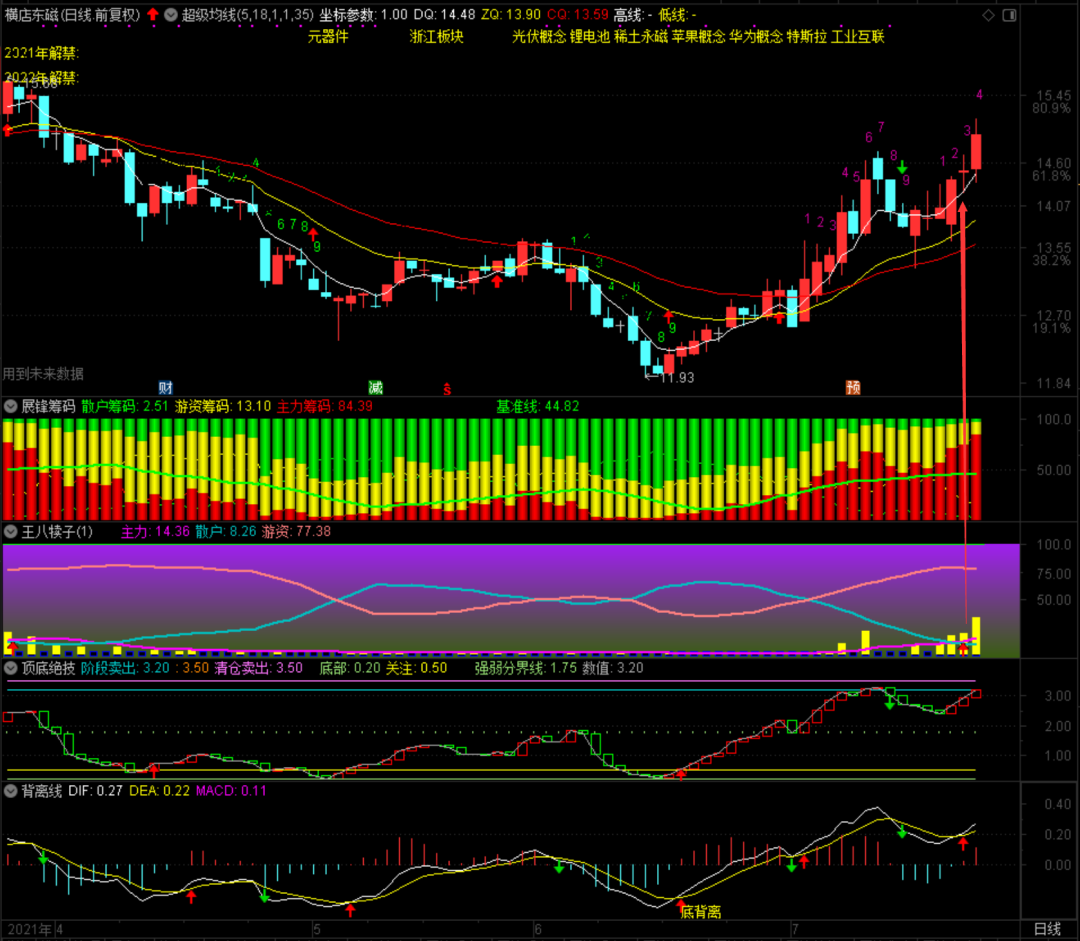 昨天有一只红包股是横店东磁,我发出的时候有一个股友很抗拒,觉得这个股票已经高了,不应该再买了。我没有收到的红包,因为就选择角度而言,如果你看得准的话,就没必要让我和你分享红包股。我的买入理由是主力线金叉了散户线,而且发生在低位。短线仍有上冲的要求,结果今天最高涨了0.75元,短期继续向上的势头依然没减!今天还有许多想说的东西,20:30讲课再说吧!