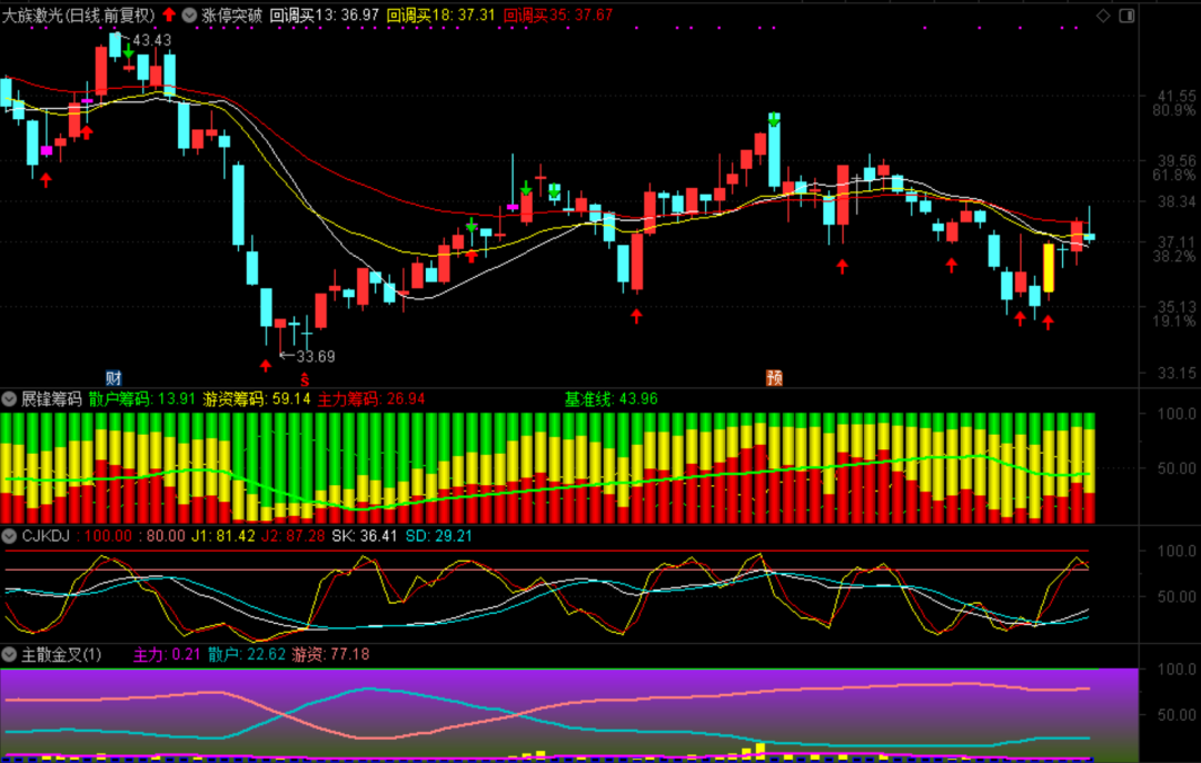 大族激光今天整体冲了一下,然后又归于平静。从技术角度看,收盘在18日指数平均线之下,虽然这么说看上去很不舒服,但指标显示该股仍然有潜力继续上行,毕竟短期指标形态没有破坏。主力筹码26.94,少是少了一些,后面观察能不能过50,最好是可以过70,那样就该涨起来了!
