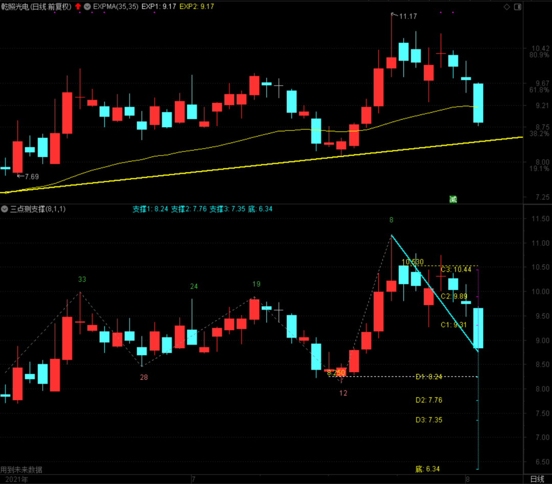以三代半导体为首的科技股出现回调,不少龙头品种纷纷下落,像乾照光电这样的,不断跌破了35日指数平均线,而且收出了比较长的阴线。短期在35日指数平均线加仓的,要注意反抽35日指数平均线时的具体情况,能上去的话就继续持股待涨,否则就先做高抛的减法。明天该股下档的支撑在8.46元,每天向上走0.02元!时间有点不够了,21点讲课再说吧!