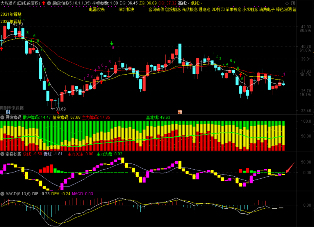 大族激光今天表现一般,主力筹码17.85,还是没有进一步集中的迹象,而且收盘定投抄底是小黄柱信号,之前我们讲过,这是一种走弱的信号。如果连续有两个小黄的柱子出来,那么接下来有可能出现下跌走势。看明天是不是有粉柱子再出来,因为只有粉色的柱子连续两个,个股才有继续反弹的动力。