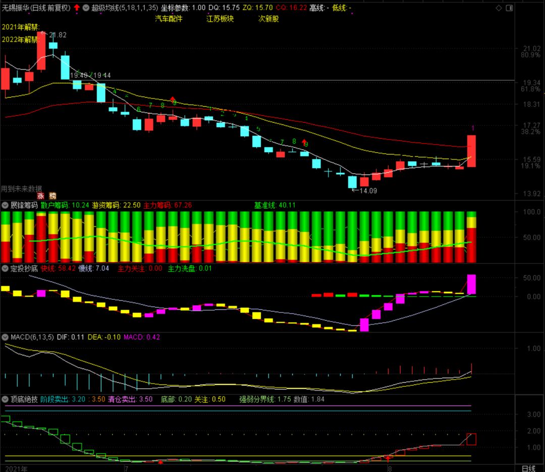 无锡振华今天封上涨停板,主力筹码升至67.26,明天涨停板价格正好是我持仓的价格,我期待着它有一个上佳的表现。就日线级别的各项指标来说,短期强势状态非常明显,结构角度第2个压力位在19.15,如果不能有效突破的话,我可能会选择暂时离场。突破站稳就往21.49元的第3个压力位看!
