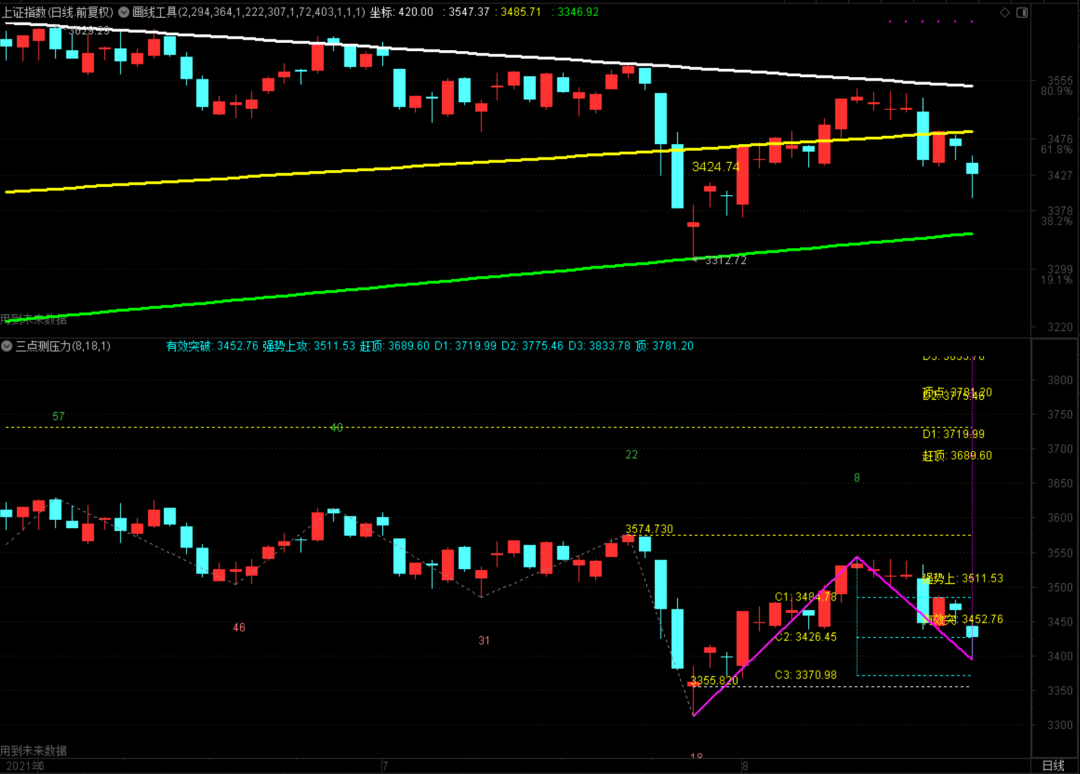 前面我不止一次说过,A股市场若想转好,离不开白酒板块的企稳与支持。今天白酒板块再下一城,让整个盘面都变得慌乱起来。昨天收盘上不着村,下不着店!今天下探是必然,但又微弱收回3426.45,让人觉得空方似乎缺乏诚意。所以,要么短期3426.45站稳三天或以上,要么去打3370~3367踩实第二脚,下周四前后会变盘,怎么变自己琢磨!