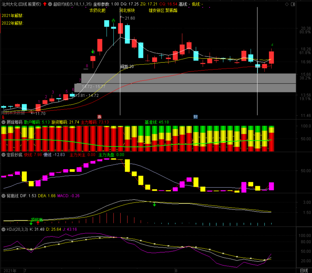 盯了四五天的沧州大化,今天终于在16.68元动了一下手,虽然背离线看着改观不大,但16.68元是该股粉柱突破慢线的预警。而且20日KDJ也是金叉状态,主力筹码73.13,收盘来看很多指标都向好。所以,下周一该股依旧值得期待,大盘表现如此之差,该股敢于这样走,就有期待的东西!