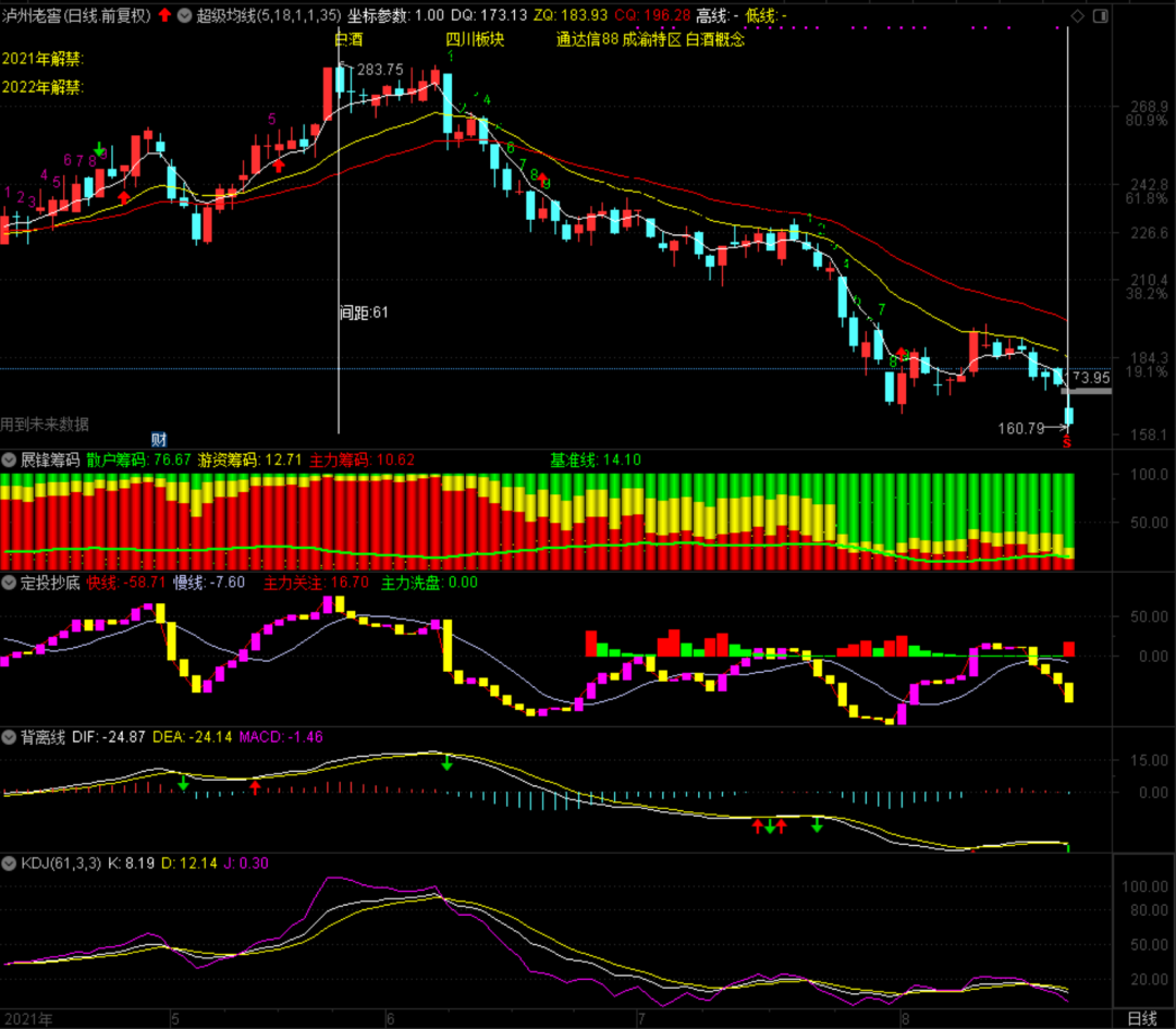 茅五泸今天全面溃败,白酒板块似乎进入了严冬。我不想在这里多讲些什么,还是那句话:A股想要走好,没有白酒板块的参与不行!泸州老窖至最高点到今天的最低点,已经跌掉了-50%;五粮液已经跌掉了-42%;茅台已经跌掉了接近-42%。这个调整其实还是蛮大的,经过连续的回调,白酒板块已经重回价值区域,后期企稳后可以多做关注!你记住我一句话:当市场上把某个板块捧上天的时候,那这个板块就是出货的时候;当市场上把某个板块批的一文不值的时候,那这个板块就是在悄悄的吸筹!不信抬头看,苍天饶过谁?