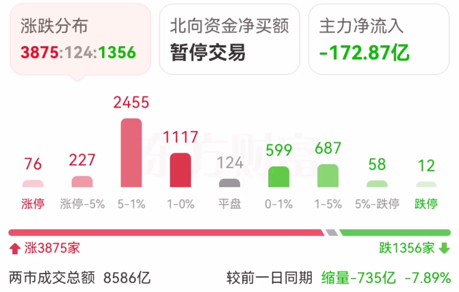 从今天数据统计来看,今日北向资金暂停交易一天。个股上涨家数3875只,下跌家数1356只,内资净流出172.87亿,主要集中在计算机设备、文化传媒、汽车整车、软件开发、互联网服务、房地产开发、汽车零部件板块上,涨停个股家数76家,跌停个股12家,两市成交总额较上一日放量735亿!