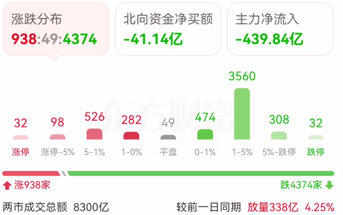 从今天数据统计来看,今日北向资金净流出41.14亿,装也不装了,直接和内资抢跑。个股上涨家数938只,下跌家数4374只,内资净流出439.84亿,主要集中在半导体、通信设备、证券消费、电子、软件开发、文化传媒、互联网服务板块上,涨停个股家数32家,跌停个股32家,两市成交总额较上一日放量338亿!