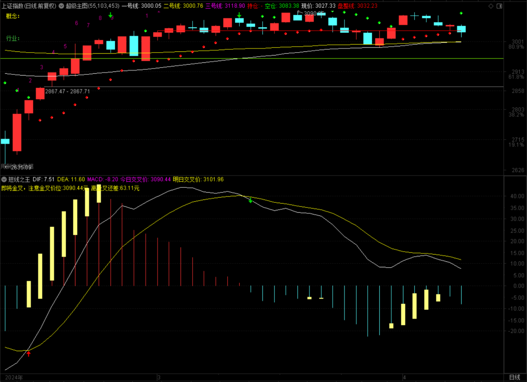 昨天说到多空临界点3025.13,今天盘中指数一度就将该点位跌穿,虽然收盘在3027.33,以微弱优势证明这个阴线可能是洗盘,但如果下一交易日真的有效跌穿的话,那么市场整体将变得极为不乐观。特别是日线的多空之王指标,现在这种将金不金的下跌态势,如果不能够很快逆转的话,大盘继续下跌将是大概率事件!