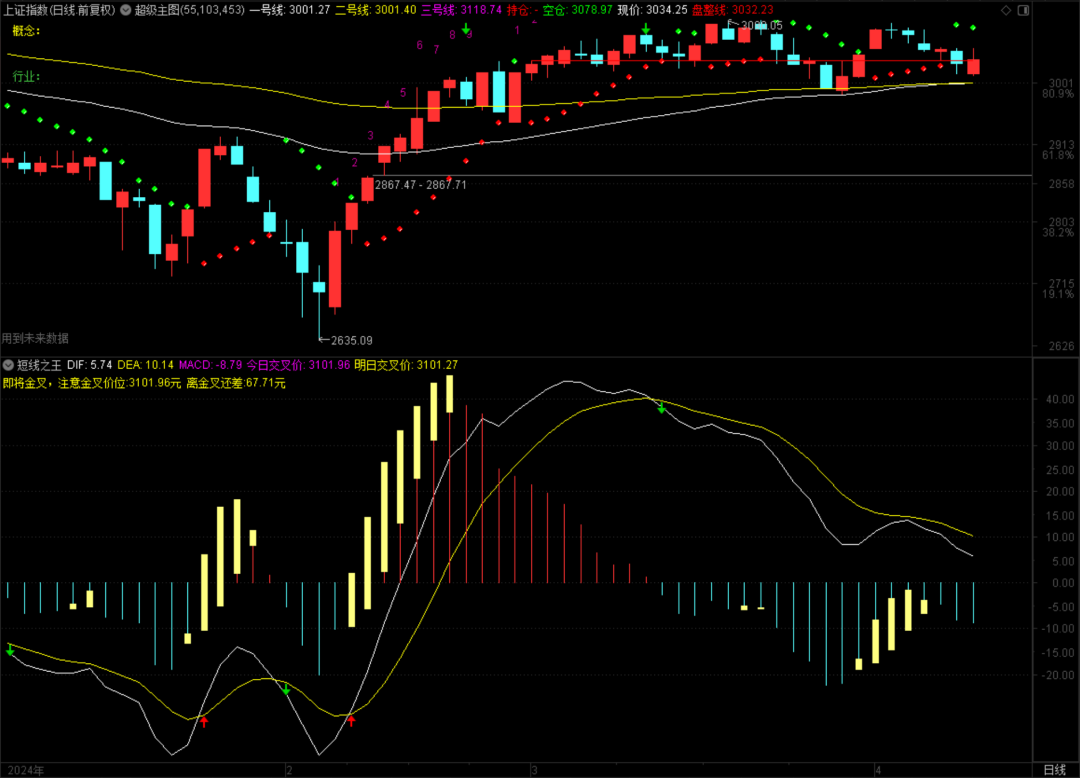 沪指今天最高冲到3050.34,浏览午间评论的时候,发现好多人都兴奋不已!而在笔者看来,日线级别短线之王指标的将金不金状态不逆转,就没必要讲指数会走到什么样的高度。3025.13是日线级别多空临界点,收盘只能算是勉强维持其上,一旦某一日收盘下破的话,整个市场的技术面将会进一步恶化,普通投资者不得不防!