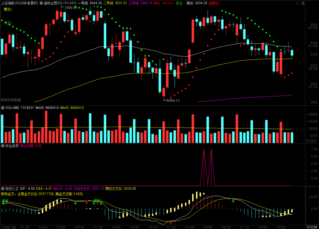 今天沪指60分钟第2小时突破多空临界点3040.77,表面上看是由空翻多了,而收盘价位在3040.77之下,似乎告诉我们这是一个假突破,除非后面能够站稳3040.77之上,否则短期大盘就不能太乐观。接下来,短线之王即将水下金叉,但对指数能够产生多大的推动,目前看还很难讲,所以这个时候谨慎为上!