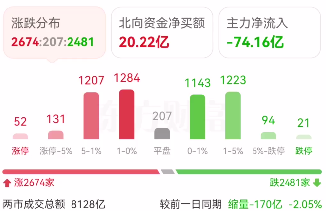 从今天数据统计来看,今日北向资金净流入20.22亿,国家队今日对指数有一定的维护,但并不坚决。个股上涨家数2674只,下跌家数2481只,内资净流出74.16亿,主要集中在医疗服务、汽车零部件、证券、交运设备、珠宝首饰、农牧饲渔、消费电子、电池板块上,涨停个股家数52家,跌停个股21家,两市成交总额较上一日缩量170亿!