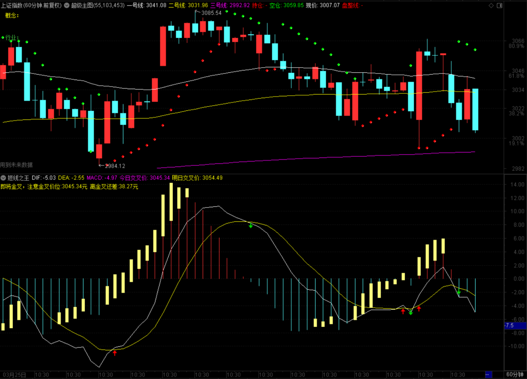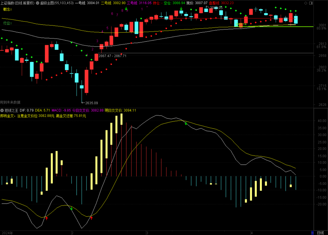今天沪指60分钟收在了多空临界点3007.64之上,如果明日第1小时继续收在3007.64之下的话,短期大盘将会继续向下调整。反之,还可能震荡反复折腾一下。从短线之王的走势看,现在60分钟的技术面岌岌可危,没有良性的消息做刺激的话,在这里单纯护盘是护不住的,所以大家要高度警惕一下!